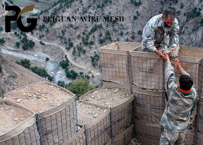 の要塞は周囲の保護、国境検査所および一時融通の避難所に使用することができる主に緑およびベージュ色の頑丈な、non-wovenポリプロピレンのgeotextileの生地と並ぶ溶接された、熱浸された電流を通された上塗を施してある鋼鉄網から成っている防御システムを形作るために多数の積み重ねから組み立てることができる防御的な障壁の新型である。